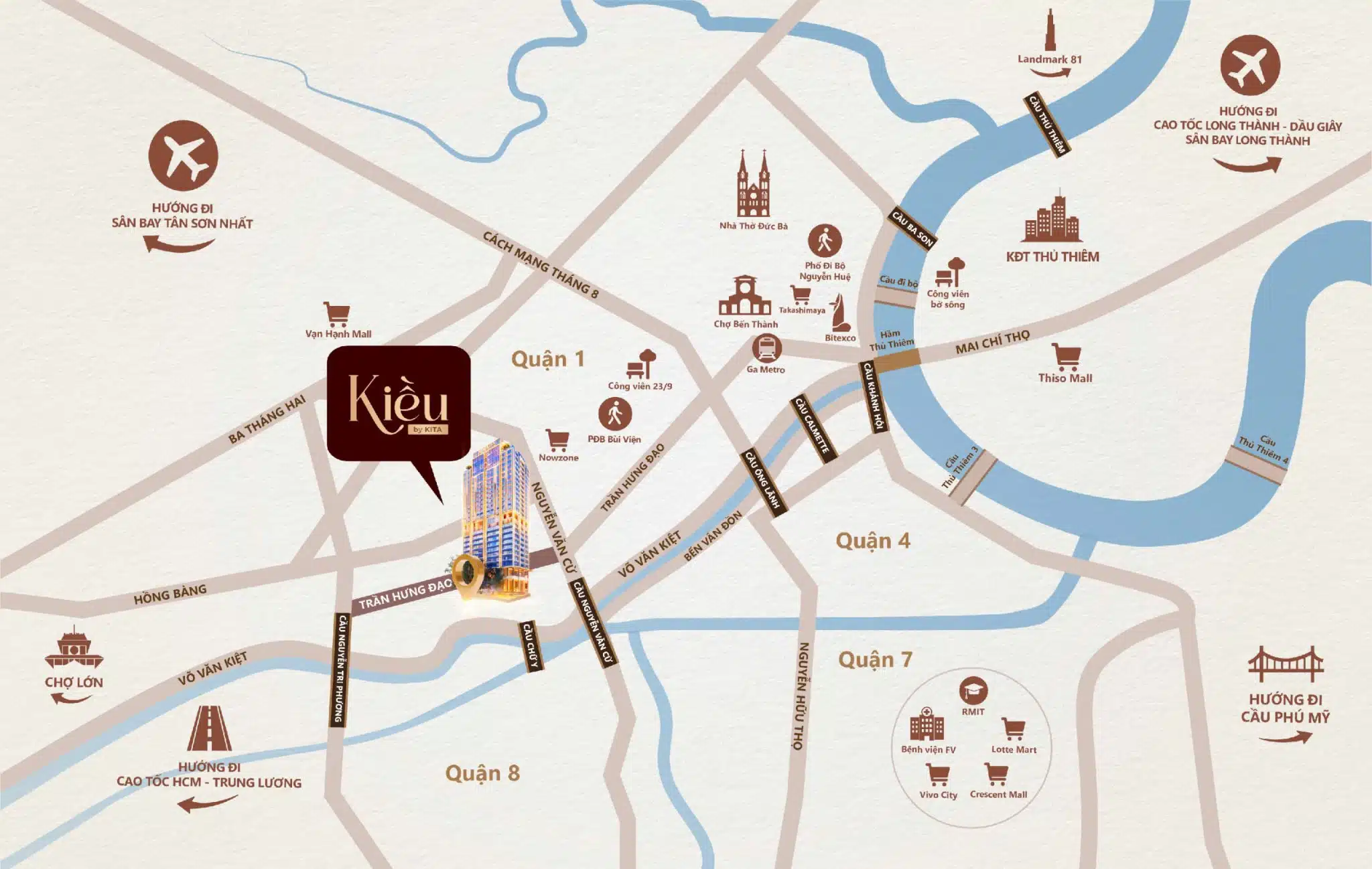 Dự án Kiều By Kita nằm tại 927 Trần Hưng Đạo, Phường 1, Quận 5, vị trí được xem là “điểm vàng giao thoa giữa 3 quận trung tâm: Quận 1 – Quận 5 – Quận 10”.
